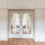 Very spacious living room en-suite with patio doors to the balcony. The beautiful natural stone fireplaces and suite cabinets are still present in the living room. The suite doors are fitted with stained glass.