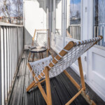 The combined living/dining room extends from the street side, overlooking the green lane, to the quiet and sunny rear balcony.