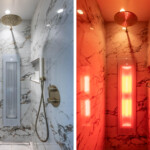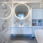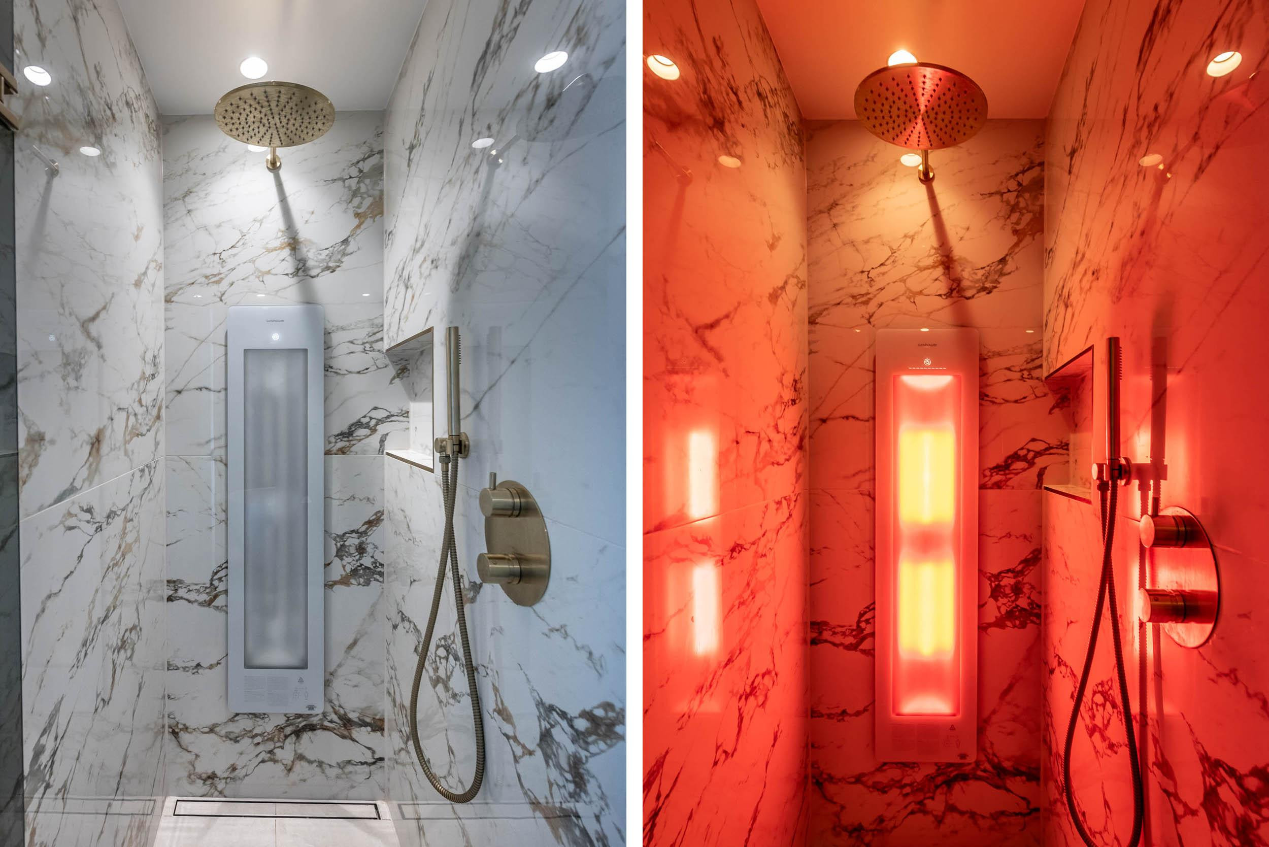 At the rear is the master bedroom with a luxurious en-suite bathroom featuring a walk-in shower/sauna, vanity, and toilet. There are also two additional bedrooms, one of which has a bathroom, suitable as a children’s room, guest room, or walk-in closet/study.