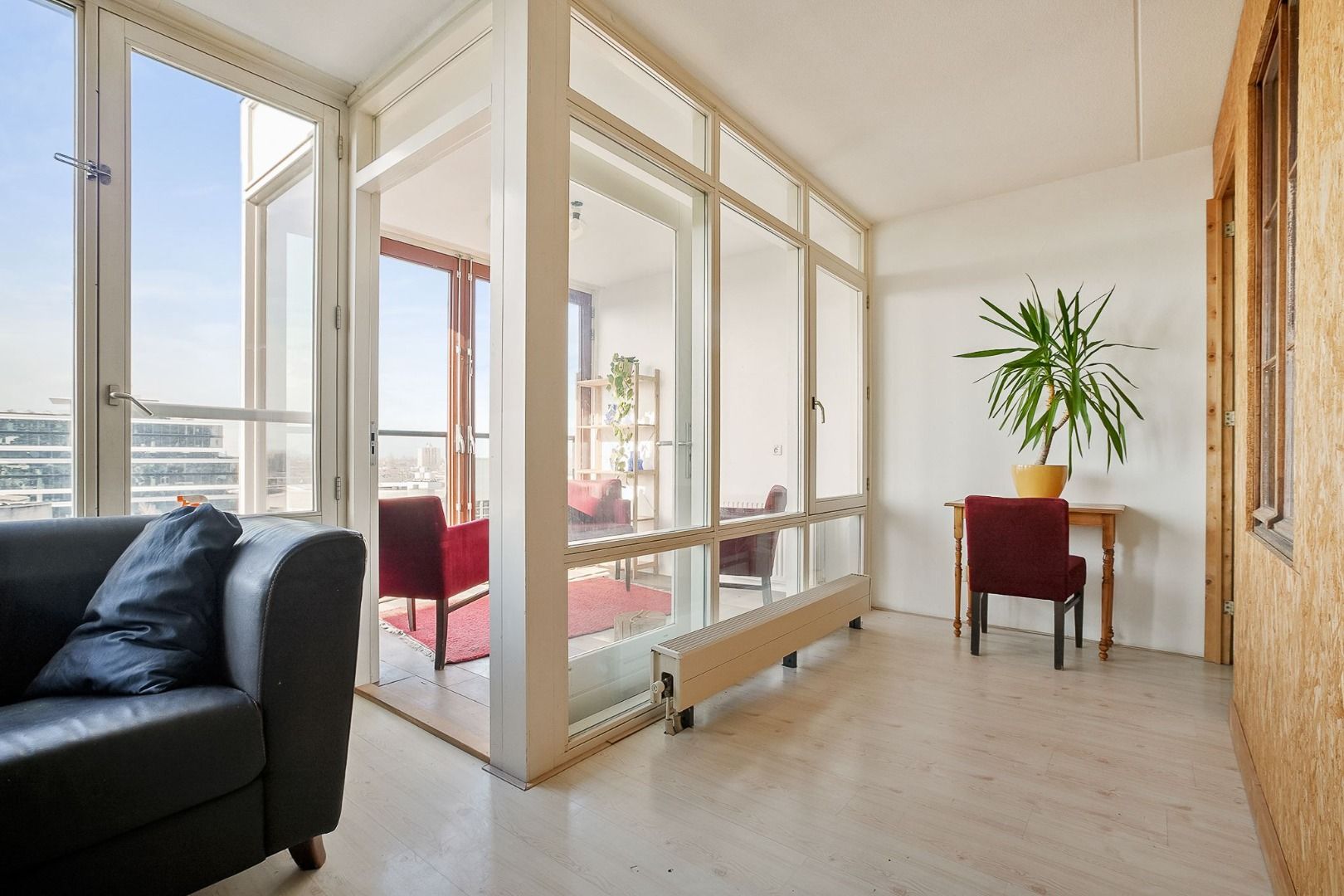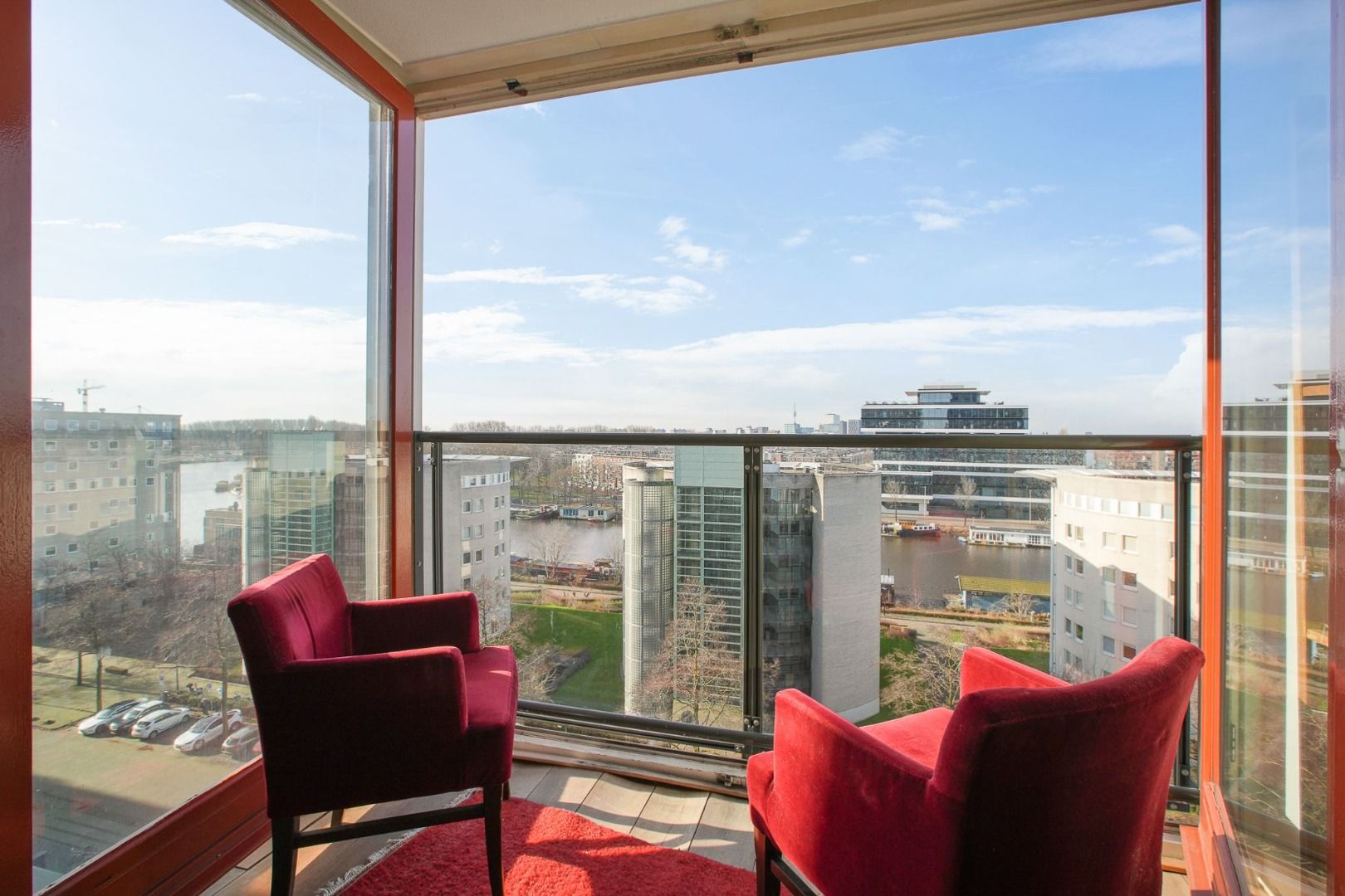 Light and lofty apartment (99m²) on the top floor (8) with beautiful views of the western skyline of Amsterdam and the Amstel. Large living room with open kitchen and conservatory bathed in a sea of light.